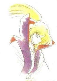 Amakusa Shiro wears simple cyan and teal robes along with a purple vest with a red interior. He has long, flowing blond hair which he keeps tied in a ponytail. A Rosary rests around his neck.