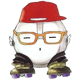Cube is a small, white, spherical robot, dressed in a red baseball cap, green roller skates in place of feet, and a pair of large orange glasses, held up by two tiny decorative wings. Small slots on his front side are made to resemble wide, slitted eyes and a mouth. It should be noted that his appearance slightly resembles that of his creator Kato, implying he had built the bot in his image.