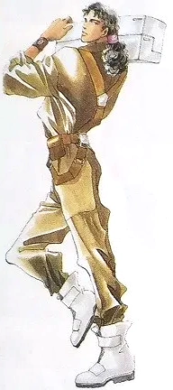 Huey wears white boots, a brown uniform along with some harnesses and a belt. He has dark skin and long black hair that is tied as a ponytail.
