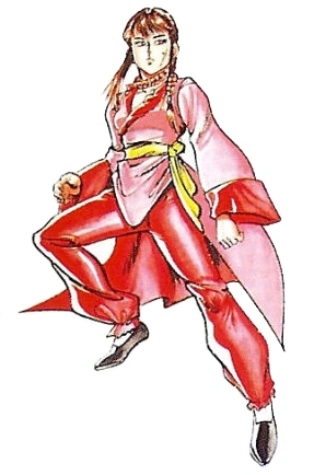 Lei is a tall and slim woman with long brown hair and two braids. She has a dark eyes and a scar on her face. Lei wears a pair of black shoes, red pants (although her sprite portrays her with black pants) and a long pink robe held by a yellow cloth belt.