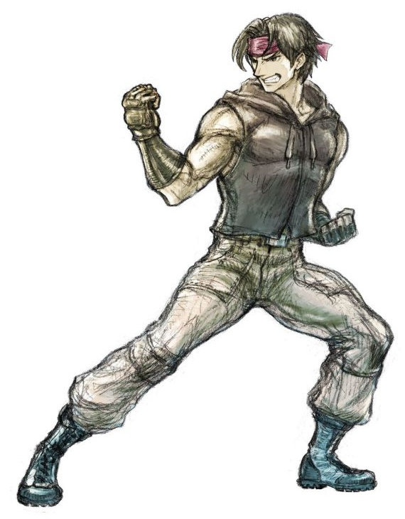 Masaru is a young, spry, muscular man. His eyes are of a dark color. He has short black hair and wears a large red headband on his head. He wears a pair of cargo pants, a purple vest and a pair of black fingerless gloves. On his feet he wears a pair of tall black boots.