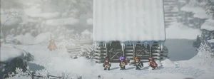 The Sundown Kid, along with the other six heroes, is transported to the Dominion of Hate by the will of Odio. As a recruitable party member, he is initially found outside the former cabin of Hasshe on the Last Hero's Grave. Each time he's spoken to, he will move to another location in Lucrece, from the Last Hero's Grave to the Seat of the Betrayers, with his whereabouts indicated by the direction he is moving towards. He finally confronts the party as they leave the Seat, where he's finally persuaded to join.
