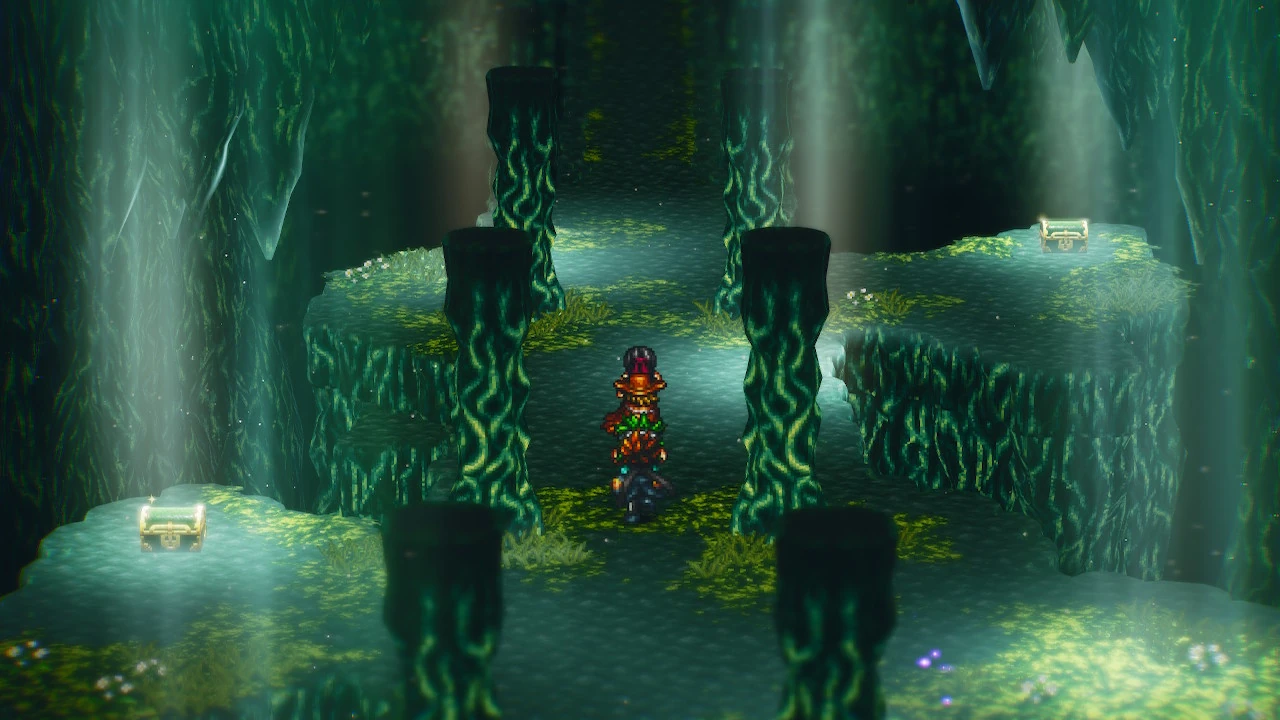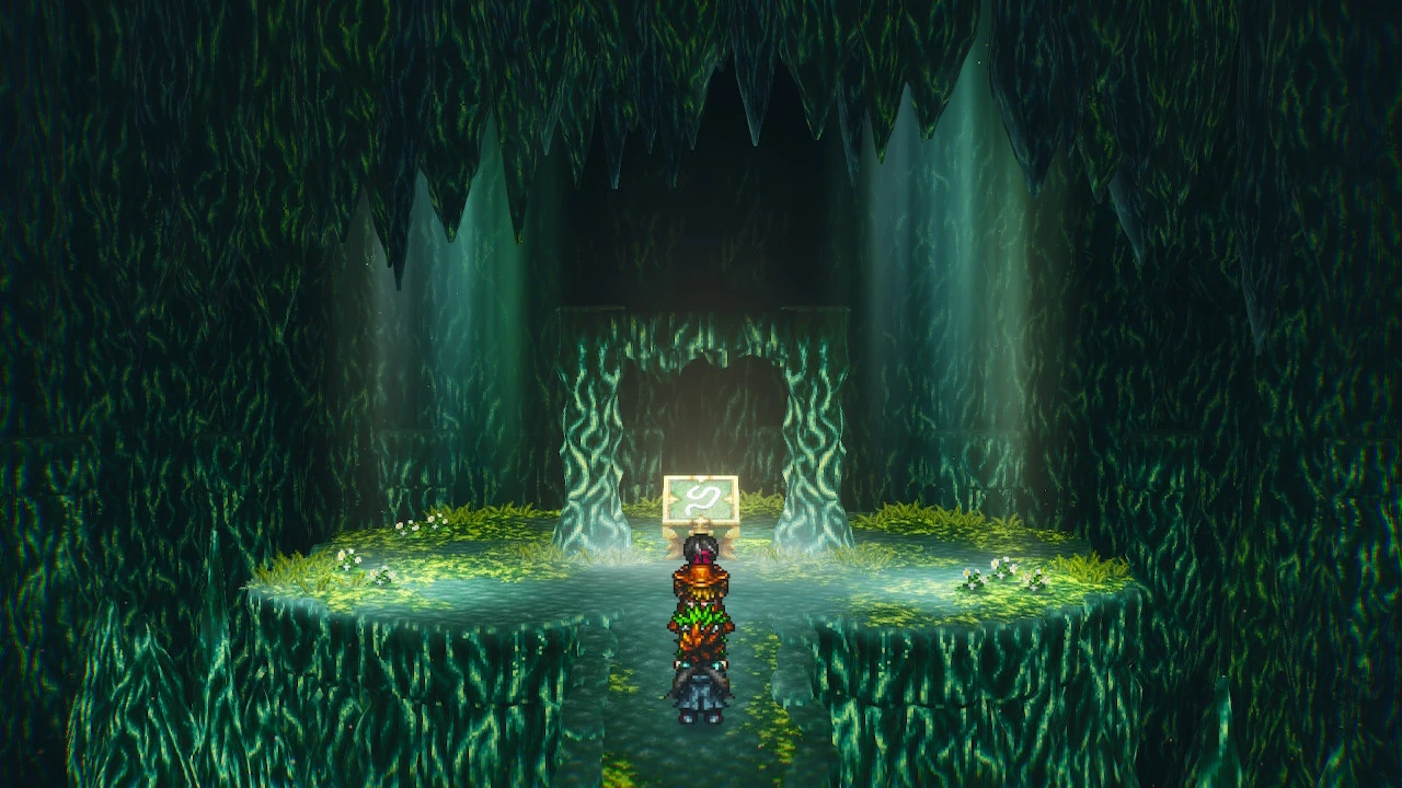 The Trial of Power is a lengthy, winding, cavern of turquoise stone. The rock formations of the walls and columns slither downward in strands, resembling vines. Large patches of moss spread across the floor, and beams of sunlight break through the ceiling, further decorating the ground.